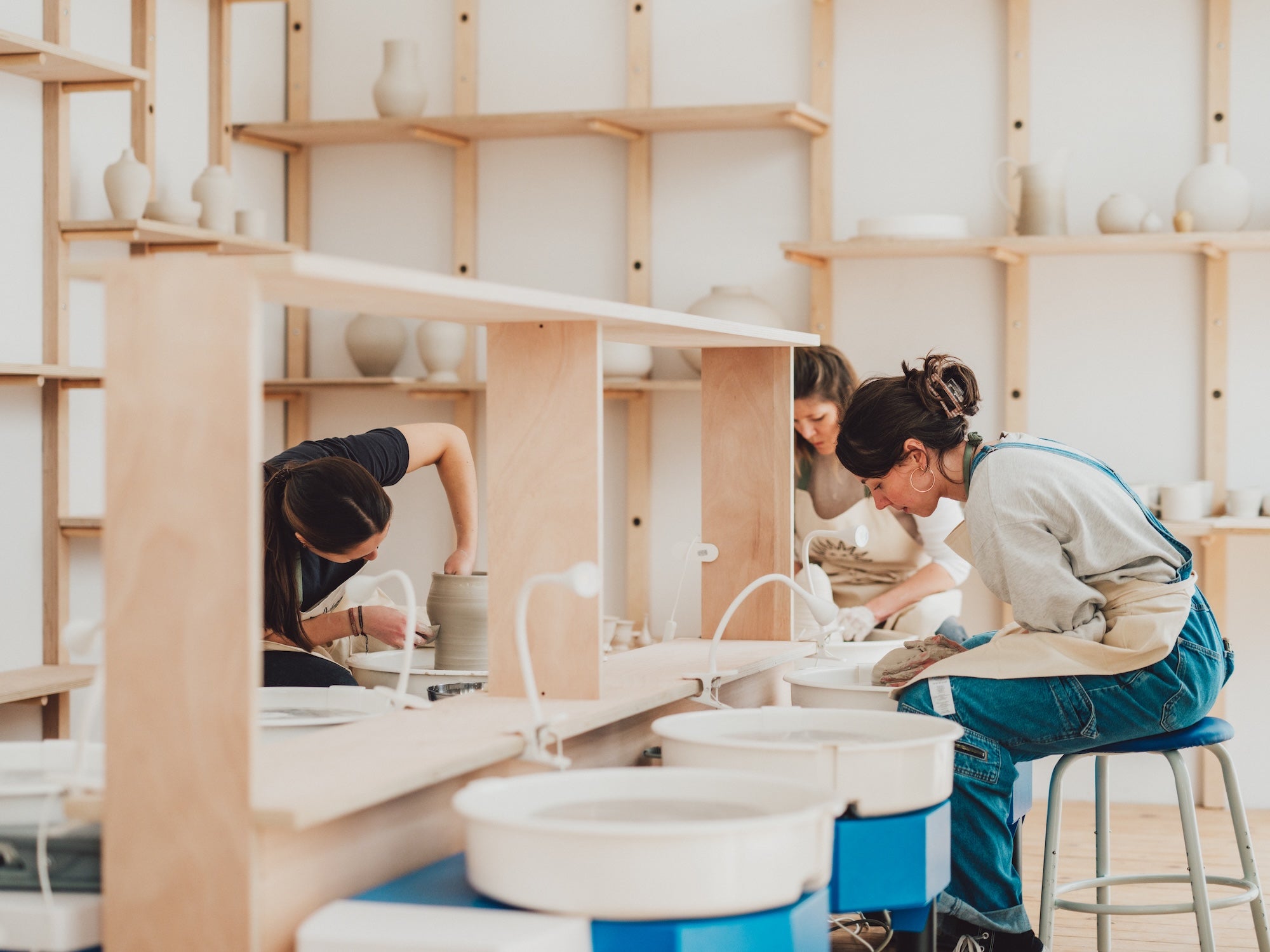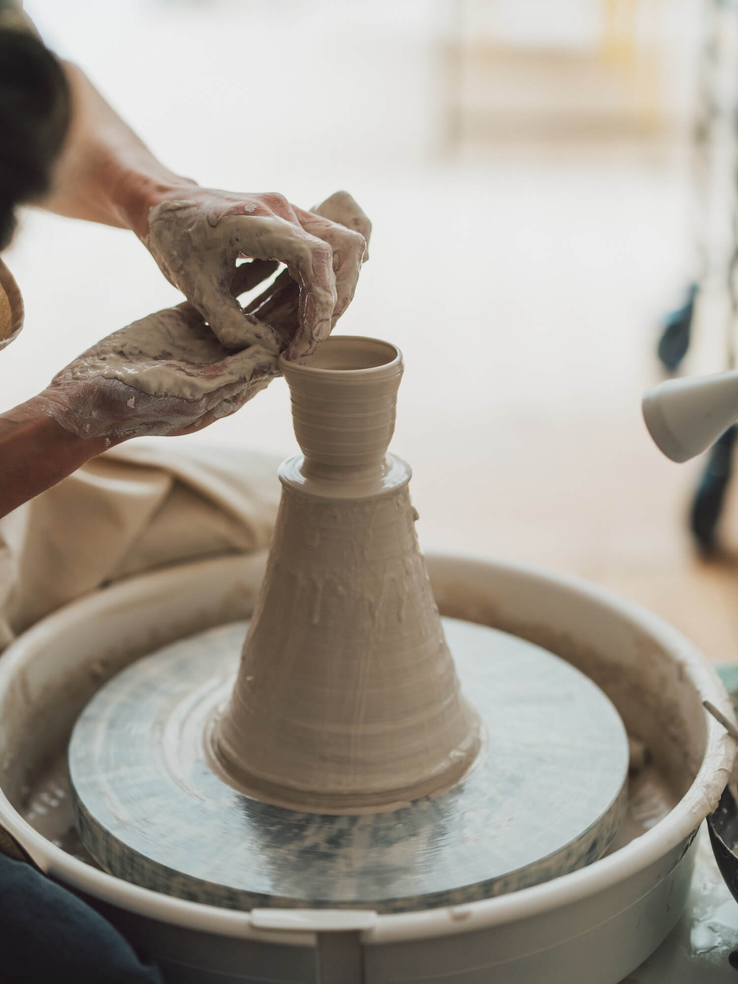 The throwing workshop is an initiatory approach to shaping clay on the potter's wheel. After a demonstration on the wheel by the potter - centering the clay, mounting it in cylinders or bowls - the participant is guided through the creation of his or her own pieces.